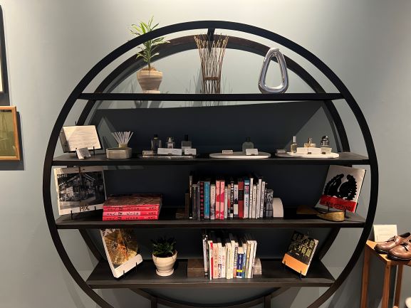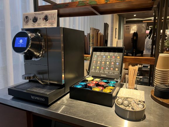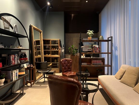 This space is like a residential lounge. It has rich leather chairs, a comfortable sofa, and a table. A bookshelf with selected books is there. Also, a premium coffee machine offers fresh coffee.