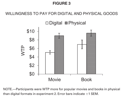 Digital goods are, in many cases, substantive innovations relative to their physical counterparts. Yet, in five experiments, people ascribed less value to digital than to physical versions of the same good. Research participants paid more for, were willing to pay more for, and were more likely to purchase physical goods than equivalent digital goods, including souvenir photographs, books (fiction and nonfiction), and films. Participants valued physical goods more than digital goods whether their value was elicited in an incentive compatible pay-what-you-want paradigm, with willingness to pay, or purchase intention. Greater capacity for physical than digital goods to garner an association with the self (i.e., psychological ownership), underlies the greater value ascribed to physical goods. Differences in psychological ownership for physical and digital goods mediated the difference in their value. Experimentally manipulating antecedents and consequents of psychological ownership (i.e., expected ownership, identity-relevance, perceived control) bounded this effect, and moderated the mediating role of psychological ownership. The findings show how features of objects influence their capacity to garner psychological ownership before they are acquired, and provide theoretical and practical insights for the marketing, psychology, and economics of digital and physical goods.